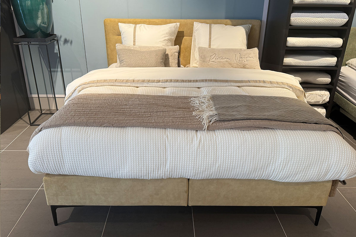 Bezoek onze showroom en ontdek de Cinderella Boxspring Tender in Adore Brass 170. Een luxe showroommodel met karakter en stijl, direct leverbaar.