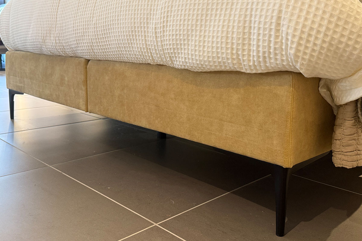 De Boxspring Cinderella Tender showroommodel is een elegante boxspring die luxe en comfort combineert met een moderne uitstraling. Dit showroommodel is uitgevoerd in de rijke fluwelen stof Adore Brass 170, een warme ochergele kleur die direct sfeer brengt in je slaapkamer.