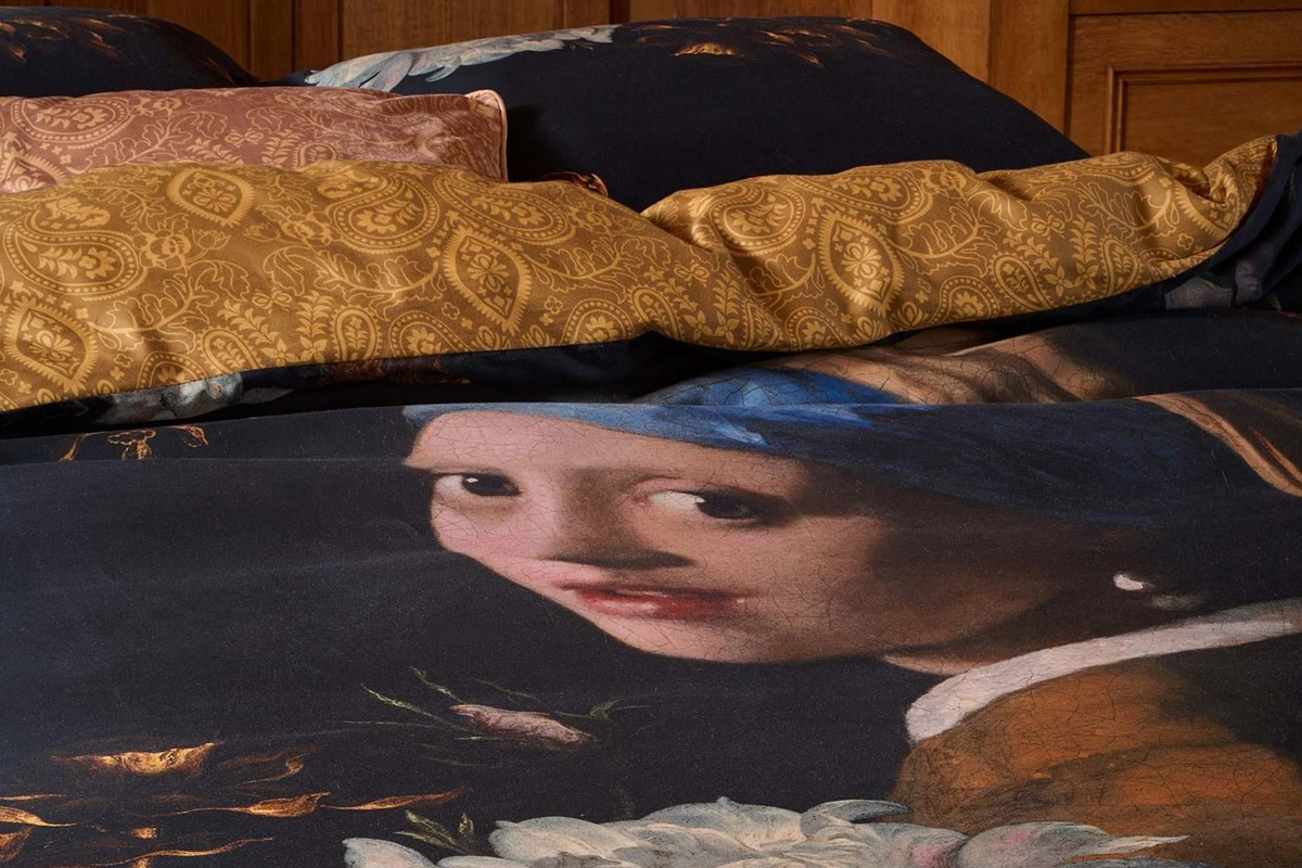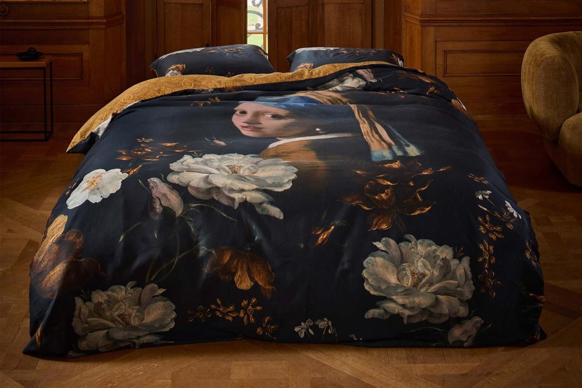 Een uniek dekbedovertrek dat kunst en comfort samenbrengt. Het klassieke portret van Vermeer en moderne bloemenprint vormen een stijlvolle blikvanger, uitgevoerd in zacht katoen-satijn met een warme gele achterzijde.
