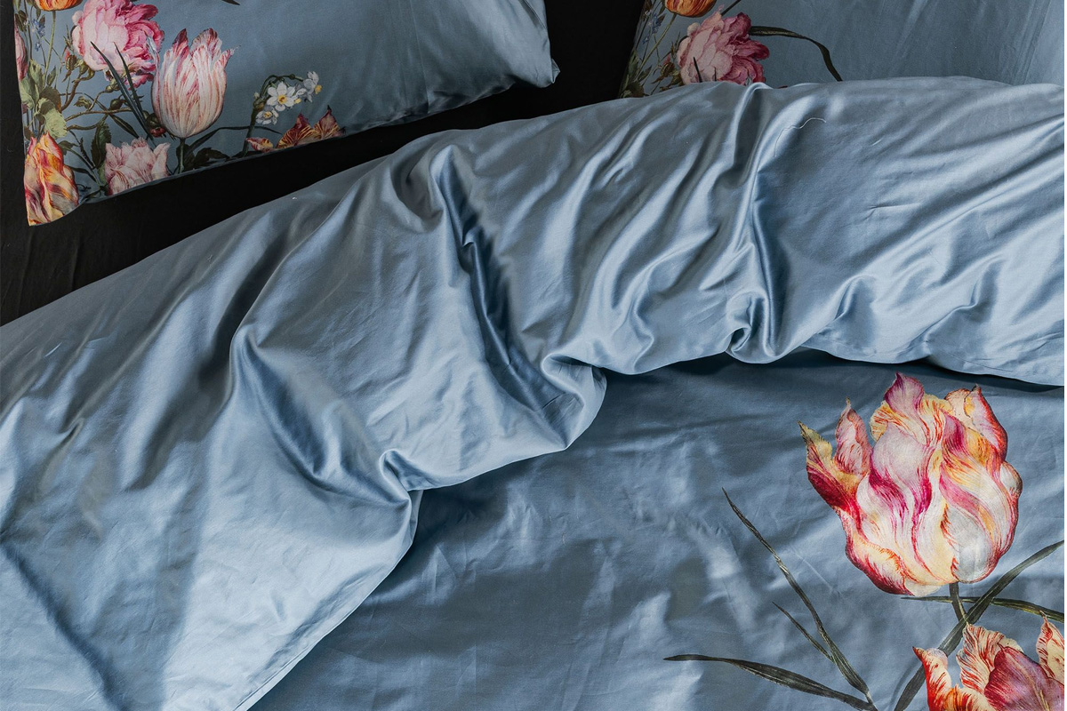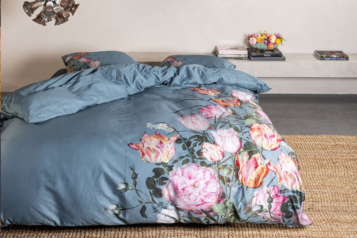 Het ESSENZA Painter’s Garden dekbedovertrek met artistieke bloemenprint op denimblauw katoen-satijn brengt luxe, warmte en elegantie in je slaapkamer.