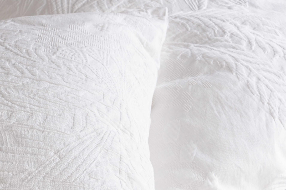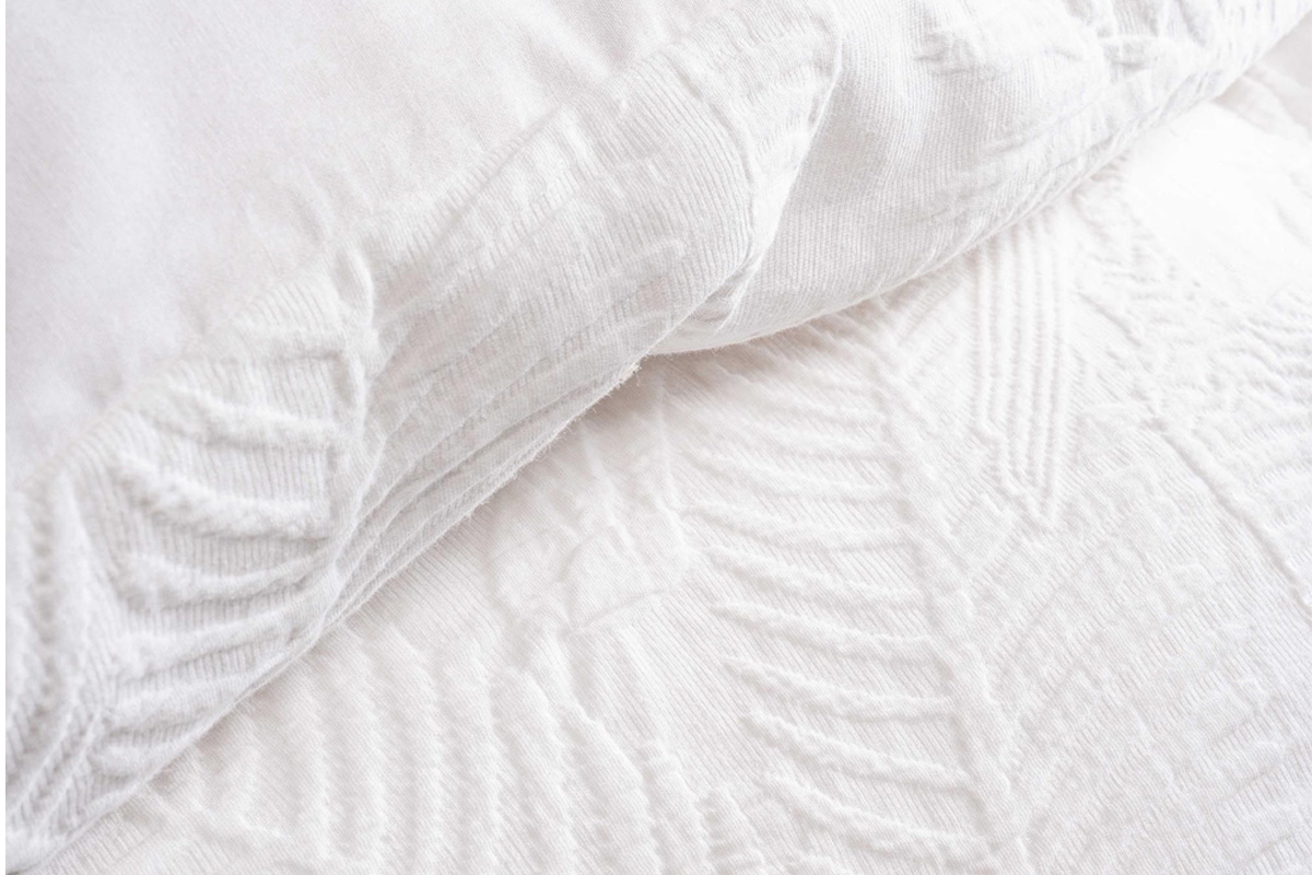 Het ESSENZA Palma dekbedovertrek in White combineert minimalistische elegantie met een verfijnd reliëf van palmbladeren. Het subtiele patroon is ton-sur-ton in de stof verwerkt en zorgt voor een rustige, stijlvolle uitstraling met een tastbare diepte. Hierdoor ontstaat een modern en sculpturaal effect dat moeiteloos past in een serene slaapkamer.