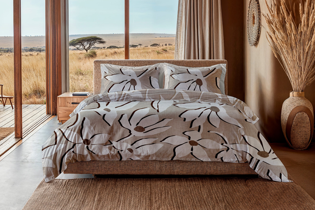 Het Heckettlane Sanaa dekbedovertrek brengt de natuurlijke schoonheid van het Masai Mara Natuurreservaat naar je slaapkamer. Grote, verfijnde bloemen in zachte aardetinten creëren een serene en tegelijkertijd levendige uitstraling. Het ontwerp straalt rust uit, maar heeft door de subtiele details en gelaagdheid een rijke, elegante diepte.