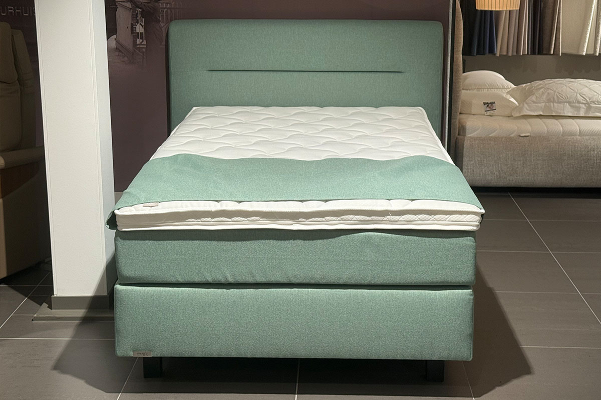 De boxspring is gestoffeerd in de stof Boech Mint groen, een frisse en eigentijdse kleur die warmte en rust brengt in de slaapkamer. Het compacte formaat van 120×200 cm maakt dit model ideaal voor één persoon die kiest voor net dat beetje extra luxe en ruimte.