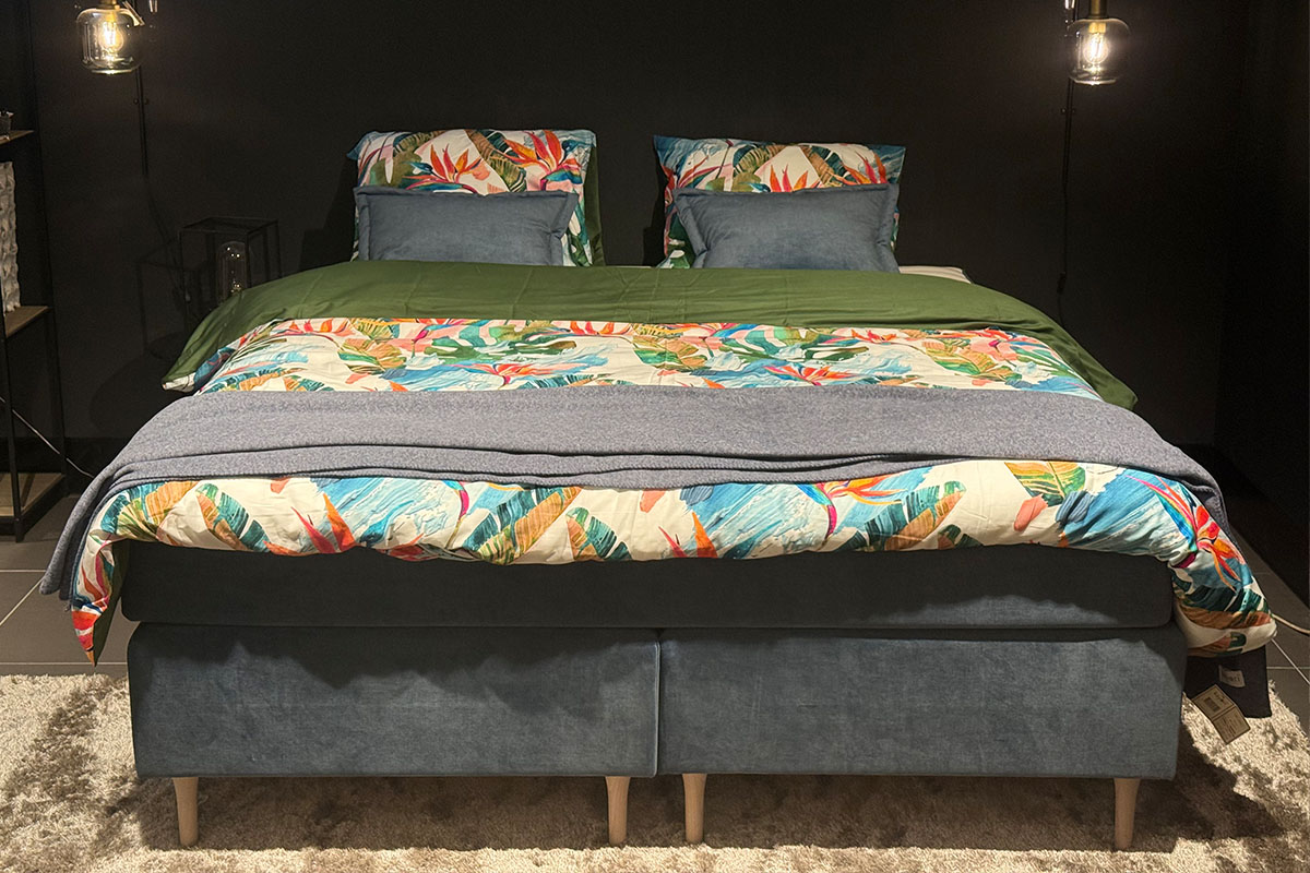 De Lagoon Blue stoffering geeft de boxspring een moderne en frisse uitstraling. Deze tijdloze kleur laat zich moeiteloos combineren met diverse interieurstijlen en zorgt voor een rustgevende sfeer in de slaapkamer.
