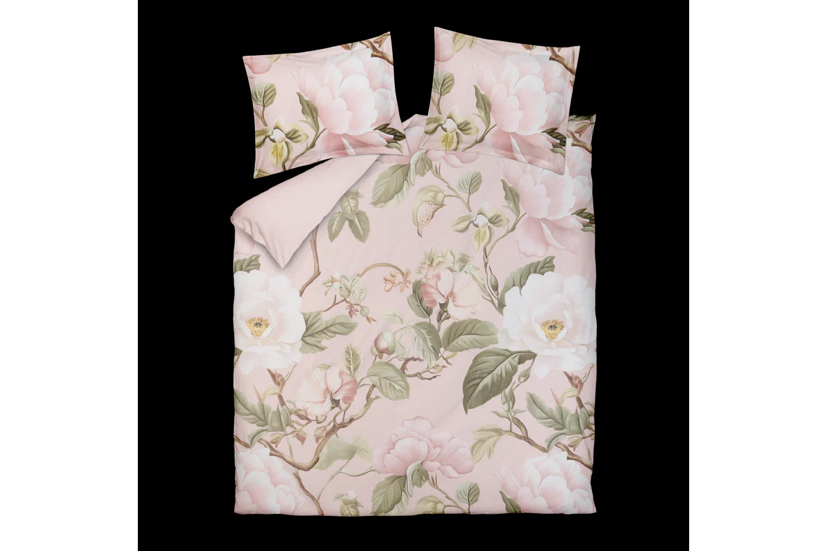 Het VanDyck Mirelle dekbedovertrek in Sepia Pink straalt romantiek en zachtheid uit. Het verfijnde dessin met bloemen en bladeren komt prachtig tot leven tegen een lichtroze achtergrond. Hierdoor ontstaat een dromerige, elegante sfeer die perfect past in een warme en sfeervolle slaapkamer.